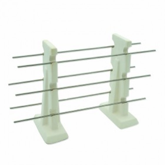 This rack is made from two durable cast stoneware supports with six 10 inch long nichrome wires. The wires rest on grooves in the rack, so they can be easily rearranged to accommodate different size pieces. The wires are heavy gauge metal and can withstand multiple firings. We recommend that if you are firing heavy items, you use shorter wires. This rack can also accommodate 6 inch replacement wires.