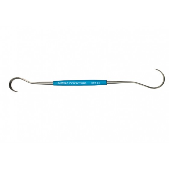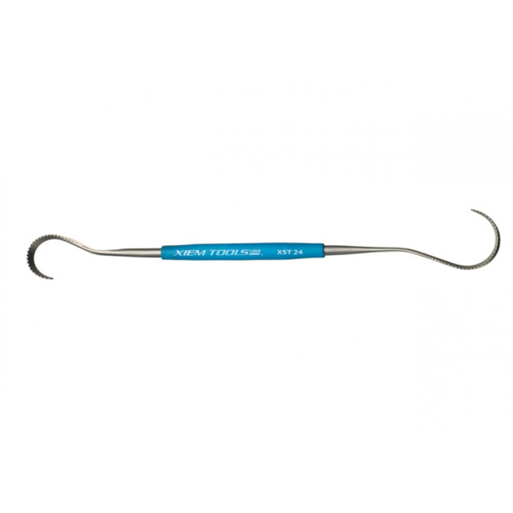 This double-end tool has three sizes of hooks with sharp, serrated teeth in each end. It is made from high-grade stainless steel and hand-forged to create a one-piece tool. Set in bright-colored rubber for comfort and secure gripping, it is fun to use and easy to find. It is great for scraping, texturing, refining, shaping and removing clay with control.