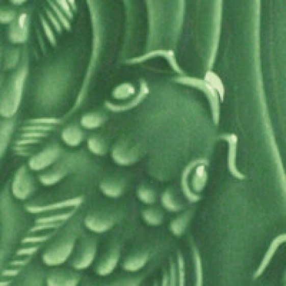 is a brilliant, glossy, opaque forest green glaze that breaks clear over